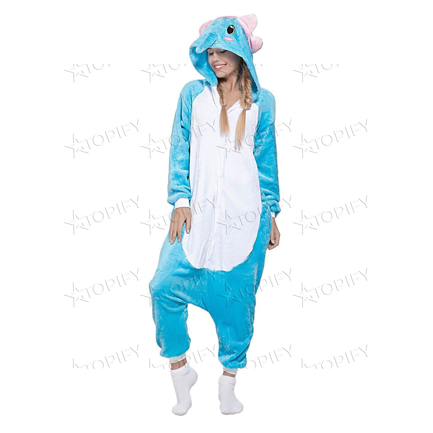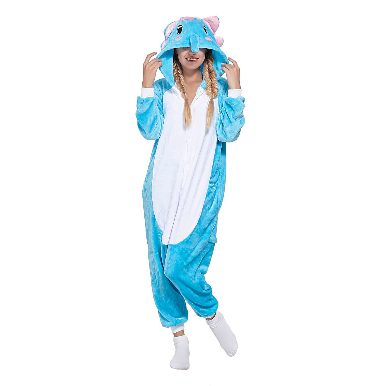 Уютный домашний комбинезон кигуруми изготовлен из приятной для тела флисовой ткани и украшен мордочкой слона на капюшоне. Модель оснащена карманами, застёжкой на пуговицы спереди и горизонтальной «молнией» сзади. Забавный хвостик прекрасно дополняет этот мультяшный образ.